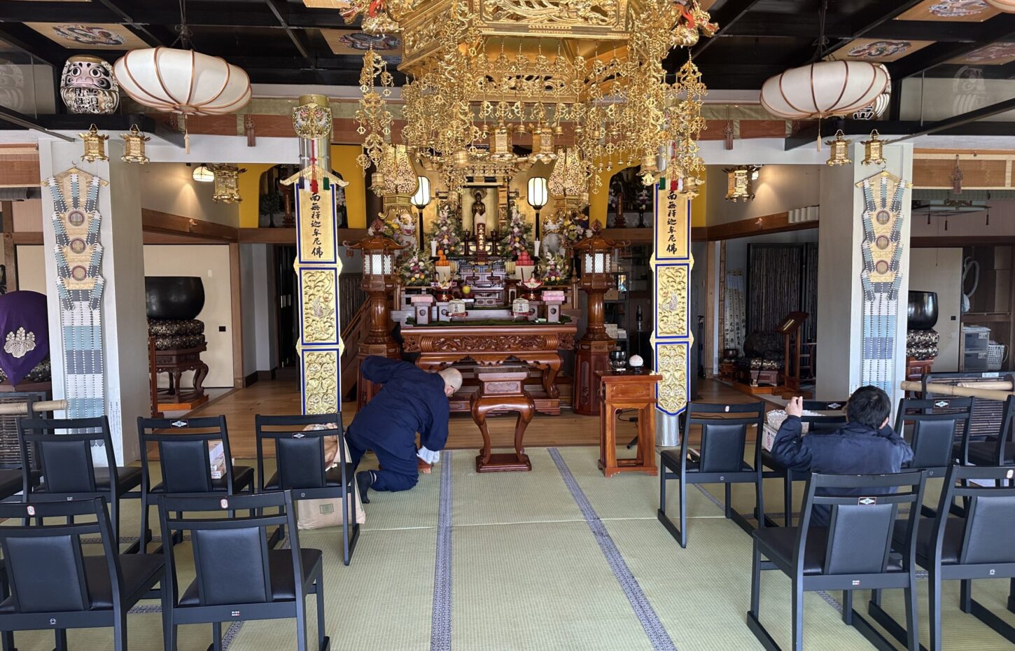 今日は本堂の大掃除をはじめ餅つきや書類の整理を職員一同でしております。内陣の須弥壇磨きや仏具の点検など日頃できないところまで隅々に配慮をして行なっております。伽藍や境内の整備の所期の目的は達成しました。今は細部に気を配り御翠簾や芸術的襖絵の製作などに傾注しております。また各所に防犯カメラやセンサーライトを設置して防犯強化にも努めております。年末年始の参拝者が年々歳々と増加しており毎年、生花が完売しております。現在は人気の樹木葬墓地が不足しております。資産価値が向上しているため墓じまいが進まず墓地不足に悩まされております。墓誌も不足をして急遽、建立しました。想像を超える勢いのため納骨堂や墓誌の設置場所がありません。やがては別院も必要になります。