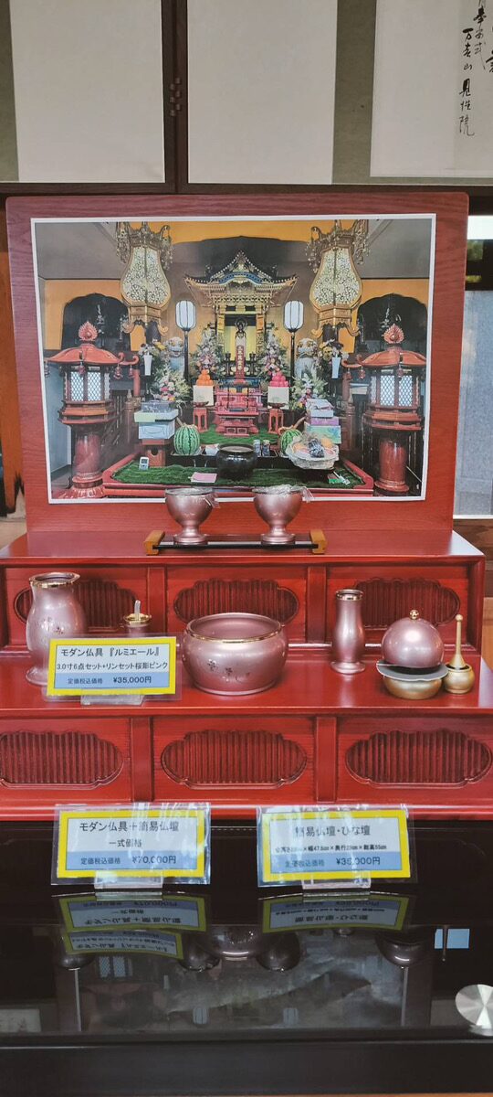 家族経営ではもはや寺院は成り立ちません。事業化をして変化に対応できる組織づくりをしたところだけが発展します。あとは淘汰される過渡期にあります。世の中全体が整理統合期にあります。人員の削減と同時に時代に合わないものは消滅する時です。現代寺院の業務内容はすべて老朽化しました。対応は遅れ破壊されていくのみの末期にあります。変化対応に迅速に取り組み改革に成功した当院はその存在を如何なく発揮するべきチャンスにあります。次に簡易仏壇の紹介をします。最近は本当に仏壇が売れなくなりました。位牌の新調のみの人がほとんどです。その理由として置く場所がないこと。畳の部屋がないこと。引っ越す場合や家の解体時の処分に困るなど理由はさまざまです。仏壇があるとお寺さんが月毎にお参りに来るので迷惑のため処分したという事例もあるようです。先祖教は衰退しております。現代人には先祖崇拝という感覚は希薄になっております。一代一代の個人の考え方に任せる時代になりました。そのために仏壇の必要性がなくなっているようです。マンションの人は場所がない。養老院に行く人には携帯できる位牌だけの方が便利と言われております。そこで当院では簡易仏壇を作製してもらい背面には当院本堂の祭壇写真を貼り付ける案を考案しております。この機会にご興味のある方には是非とも内覧に来ていただけますと幸いです。組み立て式で簡単に移動もできます。場所も取りません。お墓もお仏壇もいらないという不要論も言われております。コロナ禍を経て時代はインフレです。できるだけ持つなら携帯用,処分が簡単が好まれております。あとはできるだけシェアをして経済的負担をかけたくないという時代のようです。そんな時代に簡易仏壇はお勧めできます。また当院での本堂葬儀はこれだけの祭壇が常設されているために生花がなくても大丈夫です。どなたさまでもご利用できます。いつでも生花あり果物ありお菓子ありです。用意してもらうものはありません。見学も常時できます。今の時代に適した生き方,暮らし方を提案するみんなのためのお寺,見性院です。みなさまのお越しをお待ちしております。