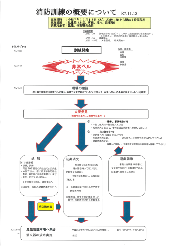 毎年,当院では火災時のための消防訓練を行なっております。非常ベルを鳴らして車椅子の人の避難も想定して行なっております。火災時のセンサー反応によって非常ベルがなるシステムとなっております。各所に消化器を数十個ほど設置して万端の備えをしております。また防犯カメラも境内に三十箇所ほど設置してあります。センサーライトも同数かと思います。本日も消防署の職員の方4名にお越しいただき職員全員が消化器を使って実地訓練をすることができました。署員の方から現在の火災や救急患者の実態なども報告がありました。気の引き締まる思いで耳を傾けました。貴重な訓示もいただき心から感謝を申し上げます。特に今日はとても冷え込み心身共に身も引き締まって緊張感のある中で実施ができたことはとてもよかったと思います。この訓練も毎年の恒例行事となりました。次回はAED(自動体外式除細動器)の実施訓練も予定しております。AEDの常設もしてあります。また追って報告もさせていただきます。合掌